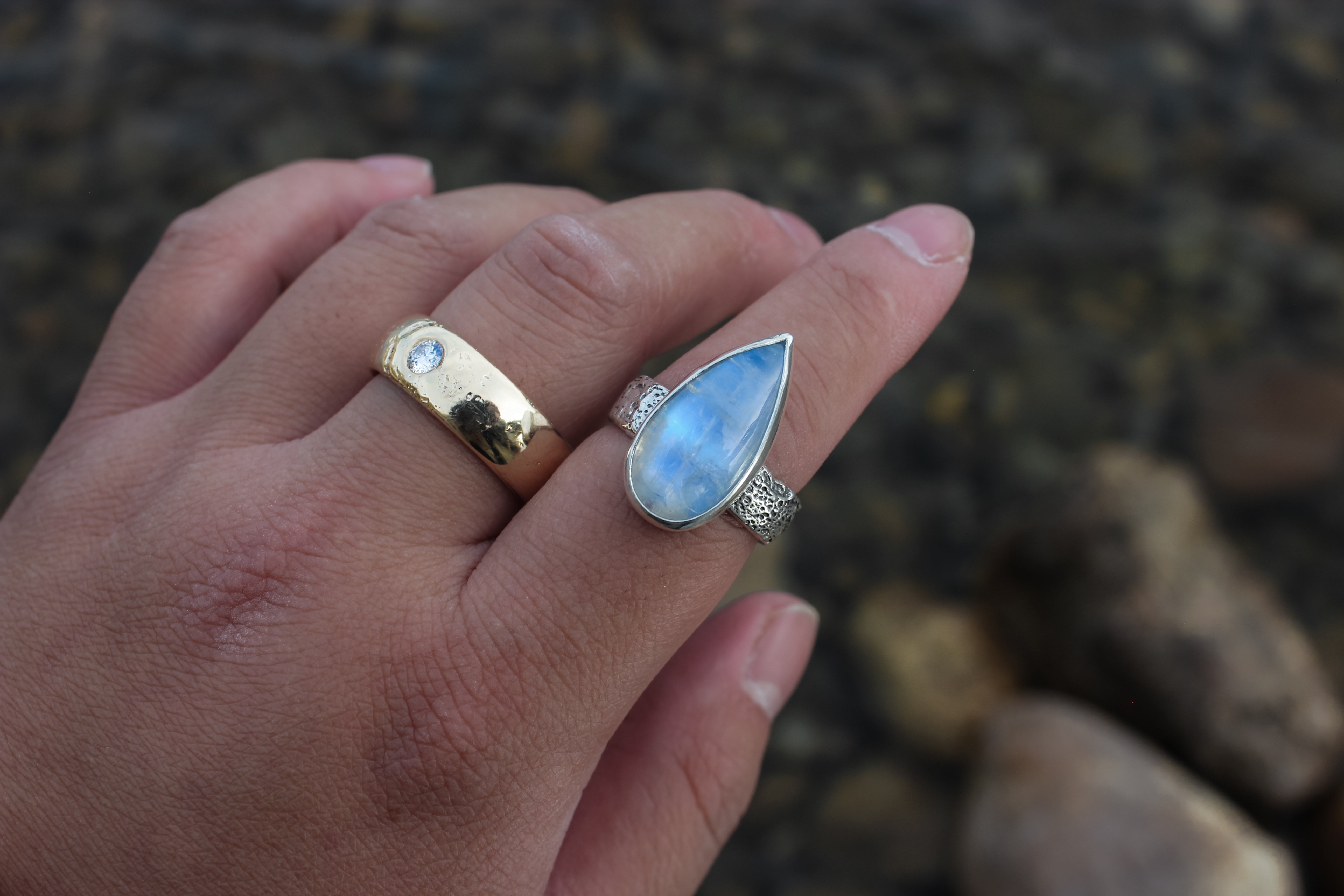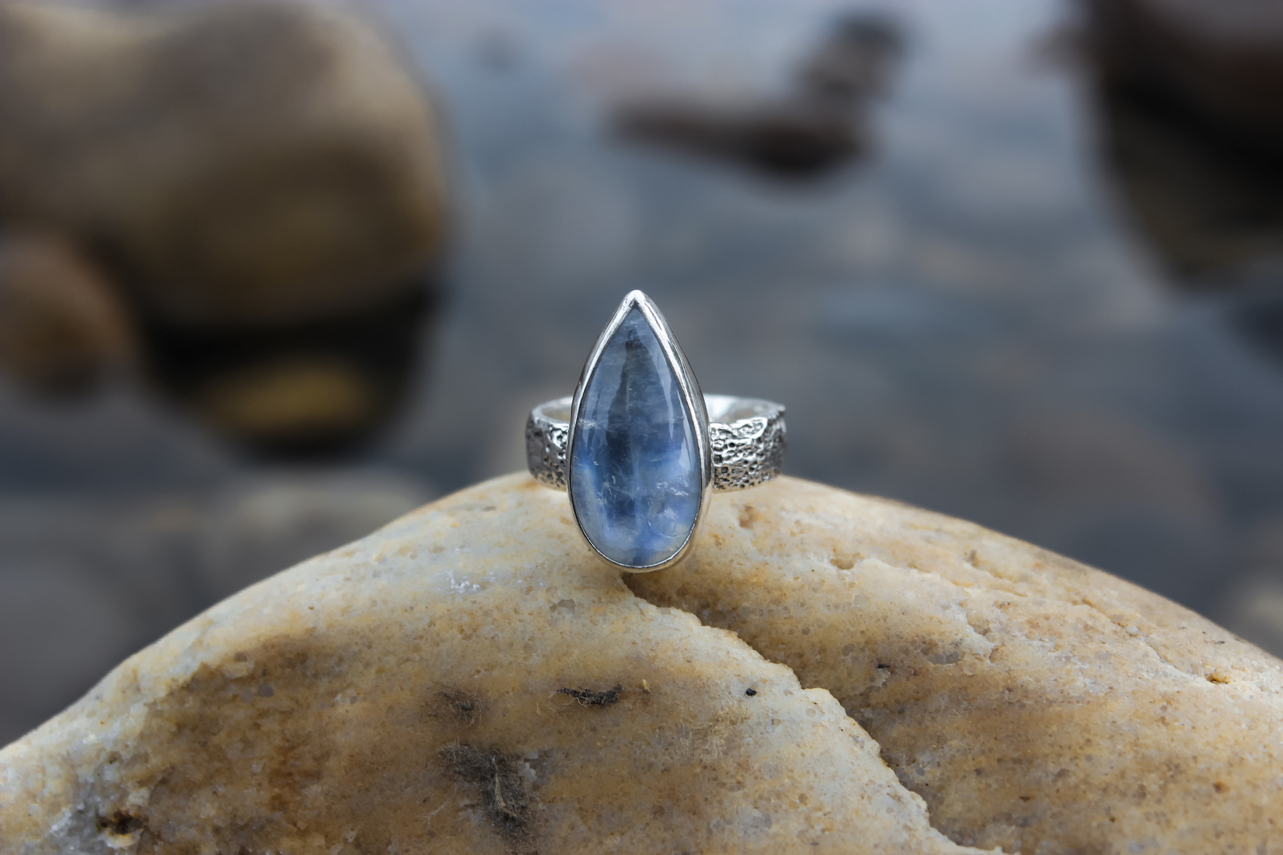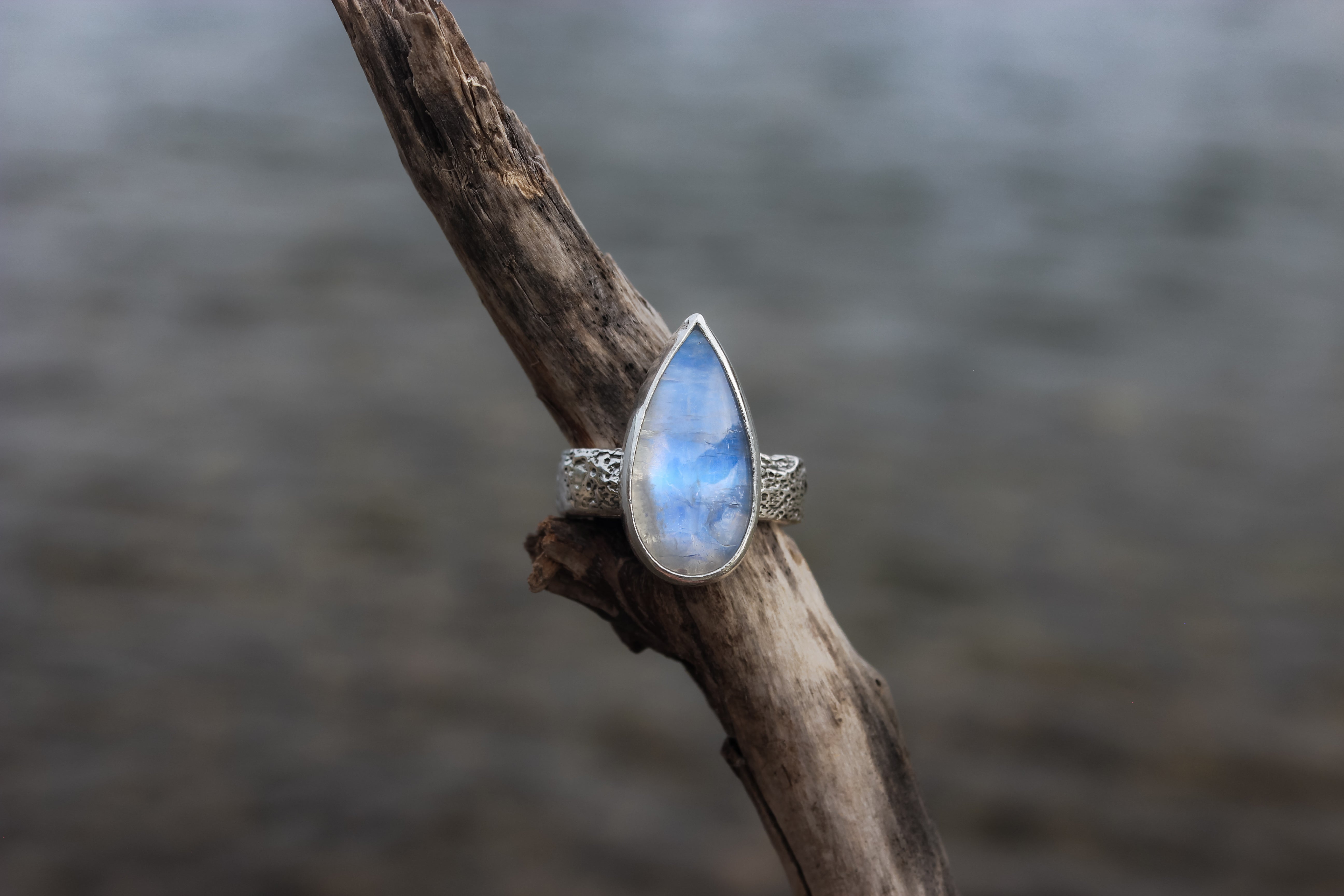 The flash on this rainbow moonstone is like the beams of the moon have been encapsulated within its icy hold. It flashes pure blue from all angles, and is one of my most precious pieces that I've been holding onto since I started this metalsmithing journey. It sits atop a textured lunar band, complete with craters and dips like the surface of the moon.