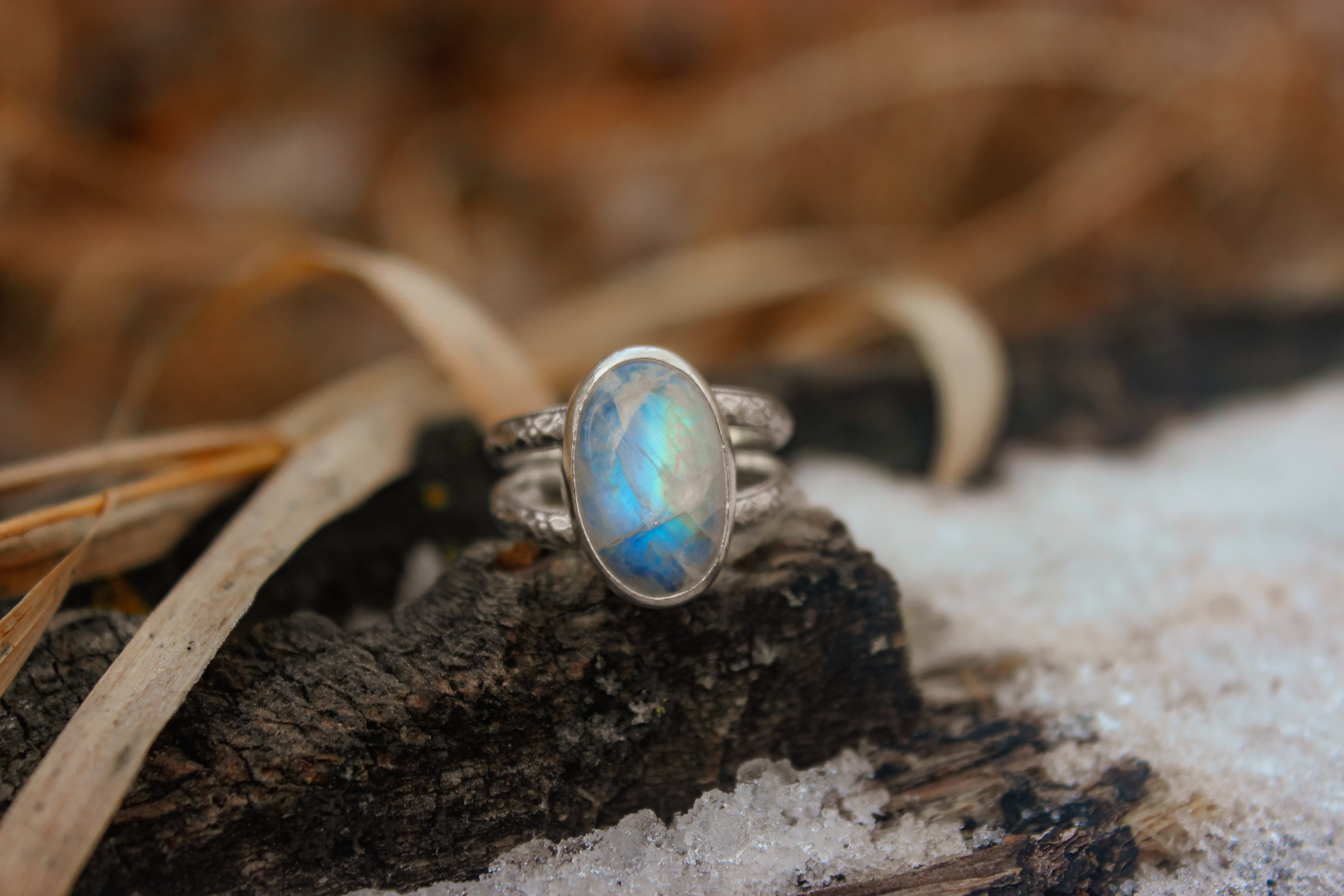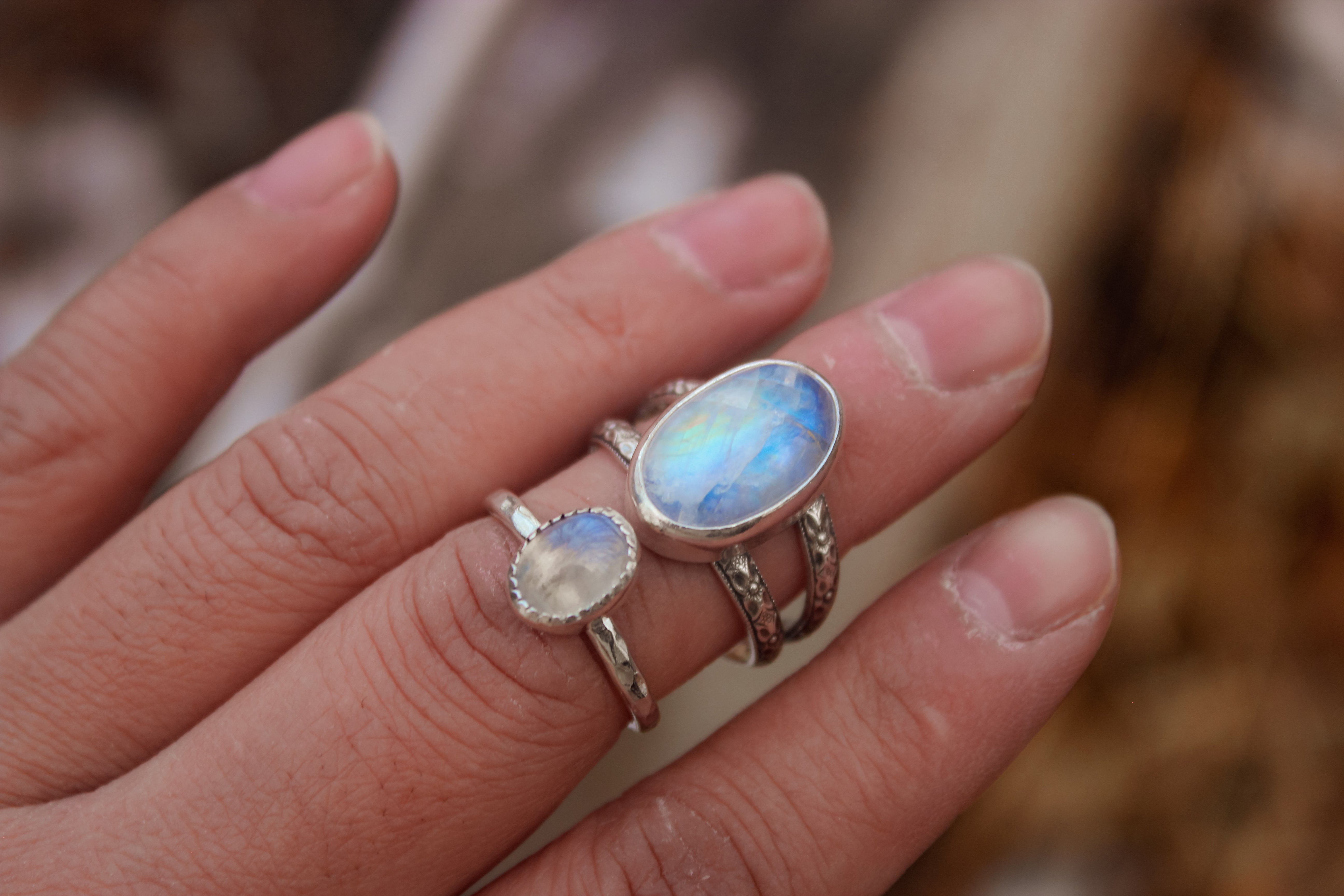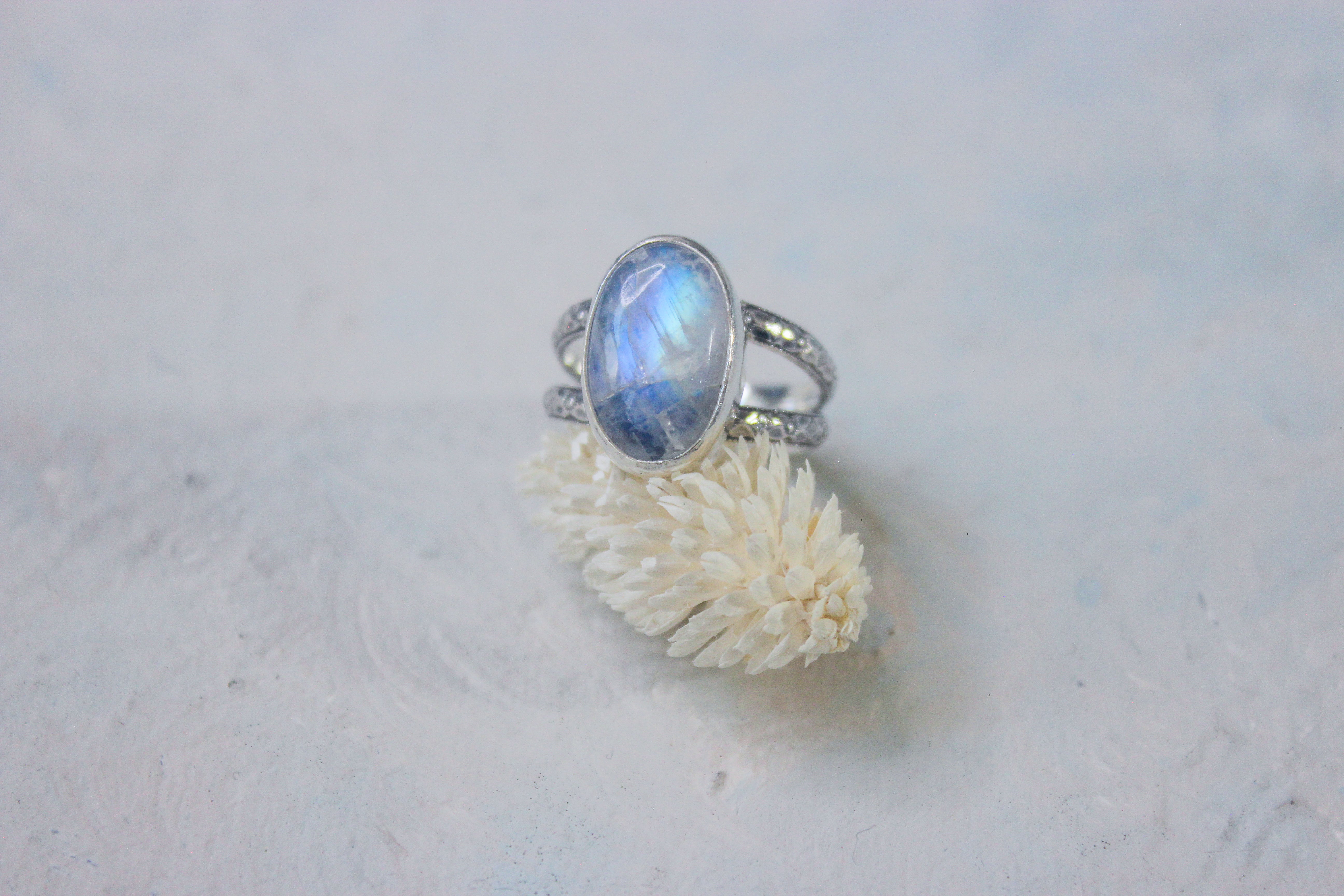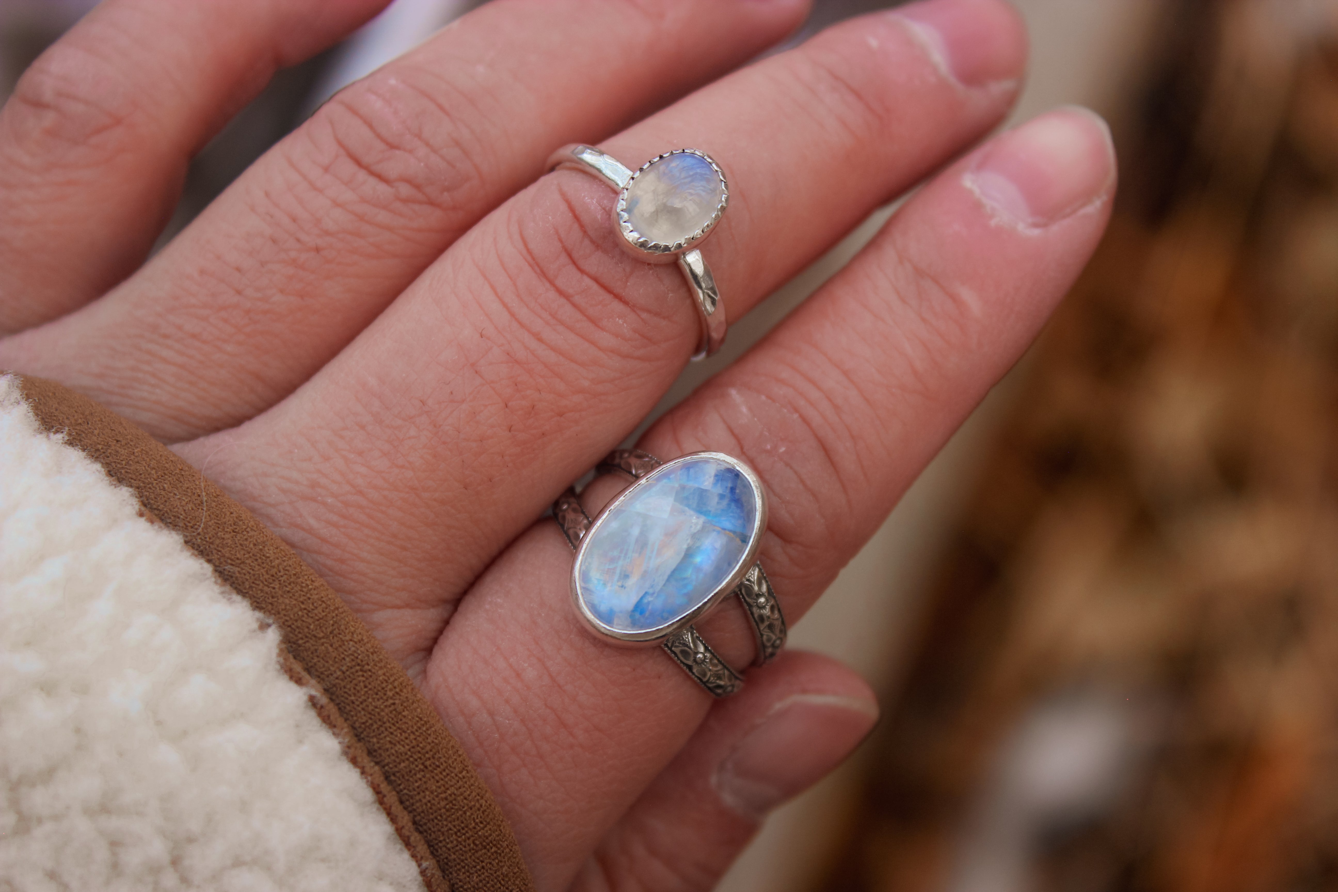 Flashy rainbow moonstone set stop an intricate floral band, simple and elegant.