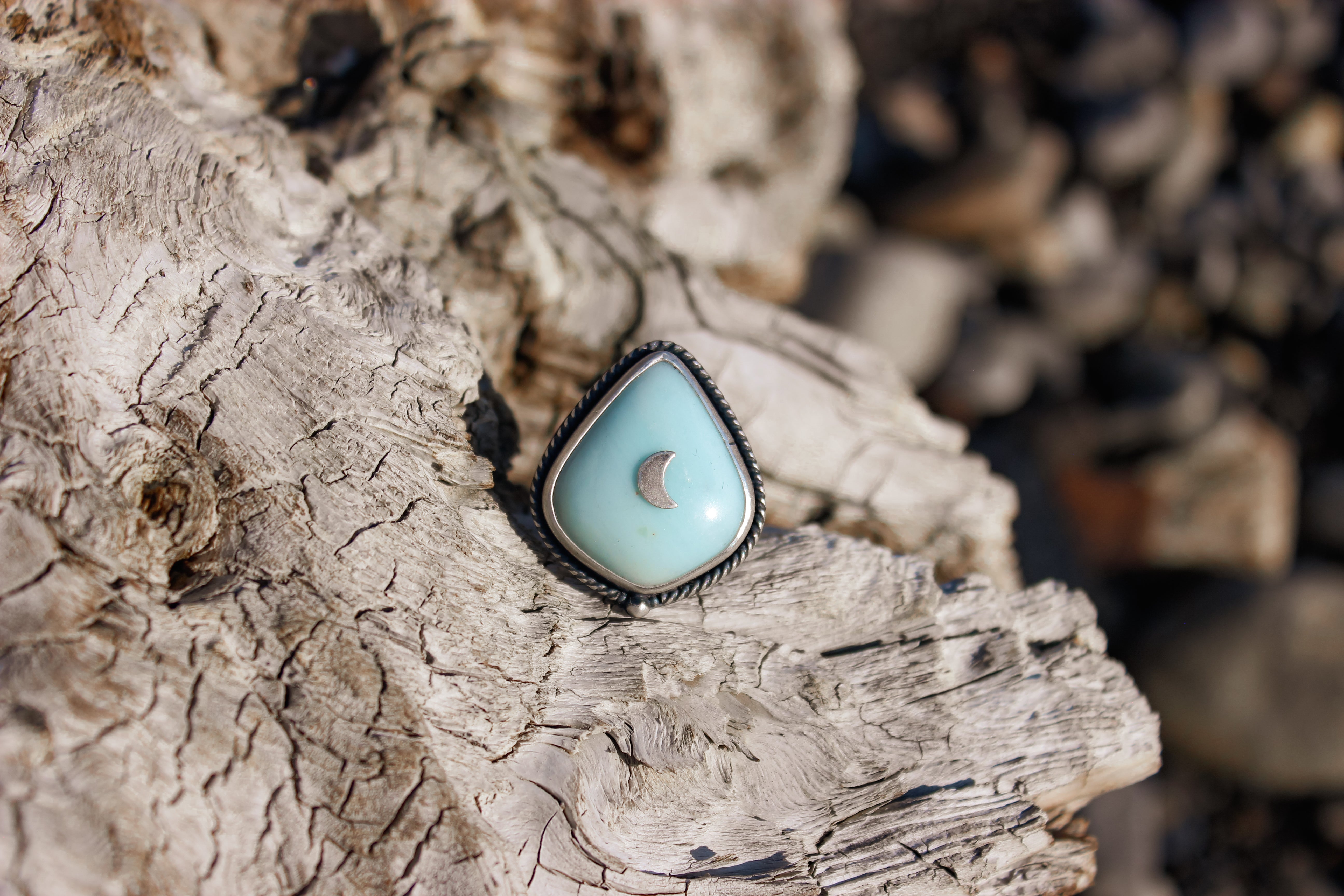 An icy blue stone from British Columbia sits atop a fluffy cloud band, celestial vibes captured in a ring. The ring band was carved out of wax and then sand casted by yours truly in my home studio. The cracks and dips in the ring band add a delightful earthy texture, rugged yet buttery smooth. An incredibly heavy, quality made ring. Carry the power of the skies with you on every adventure.