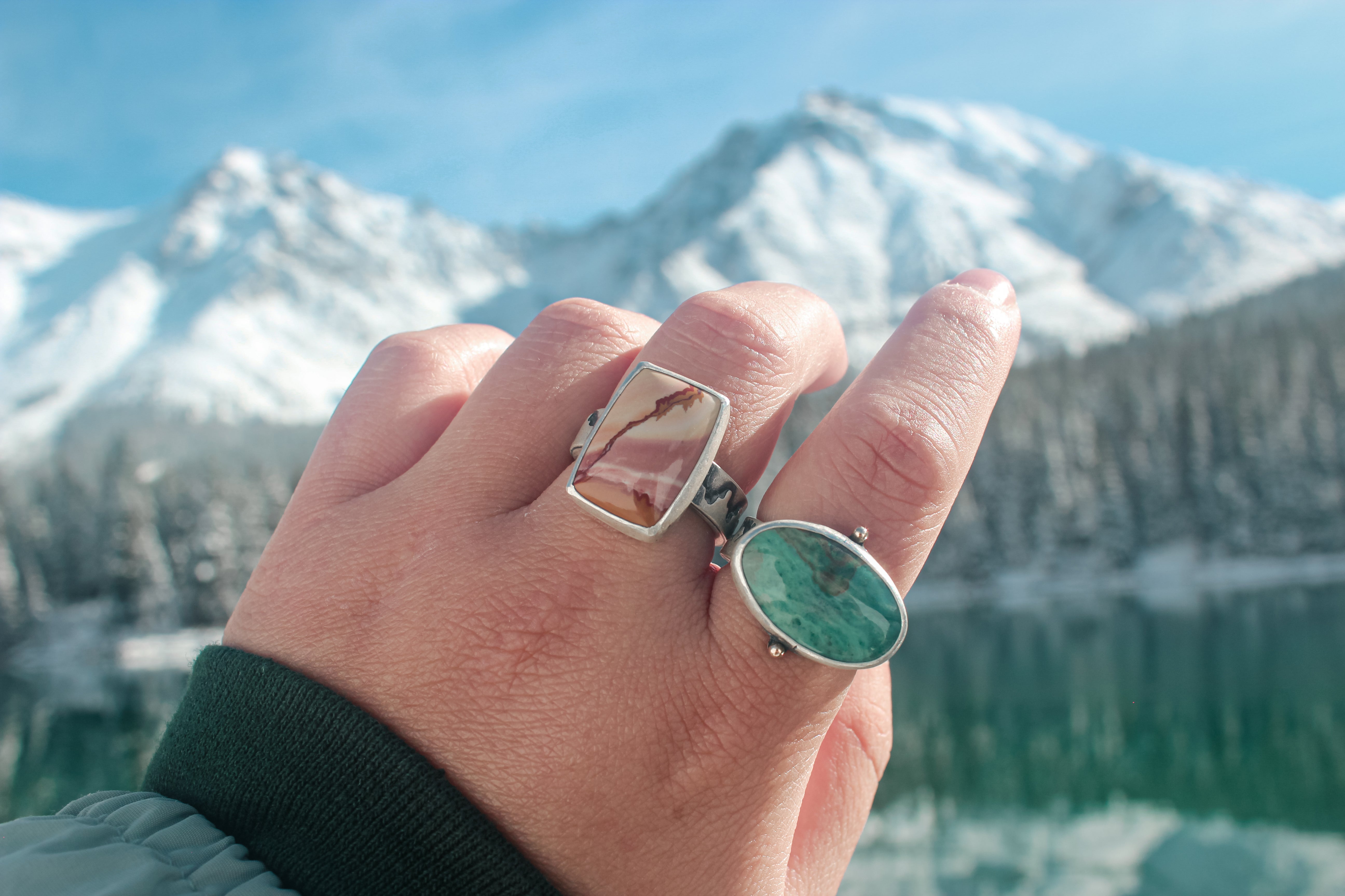 Moody Vistaite Jasper "Alpine" ring with a starry mountain horizon.