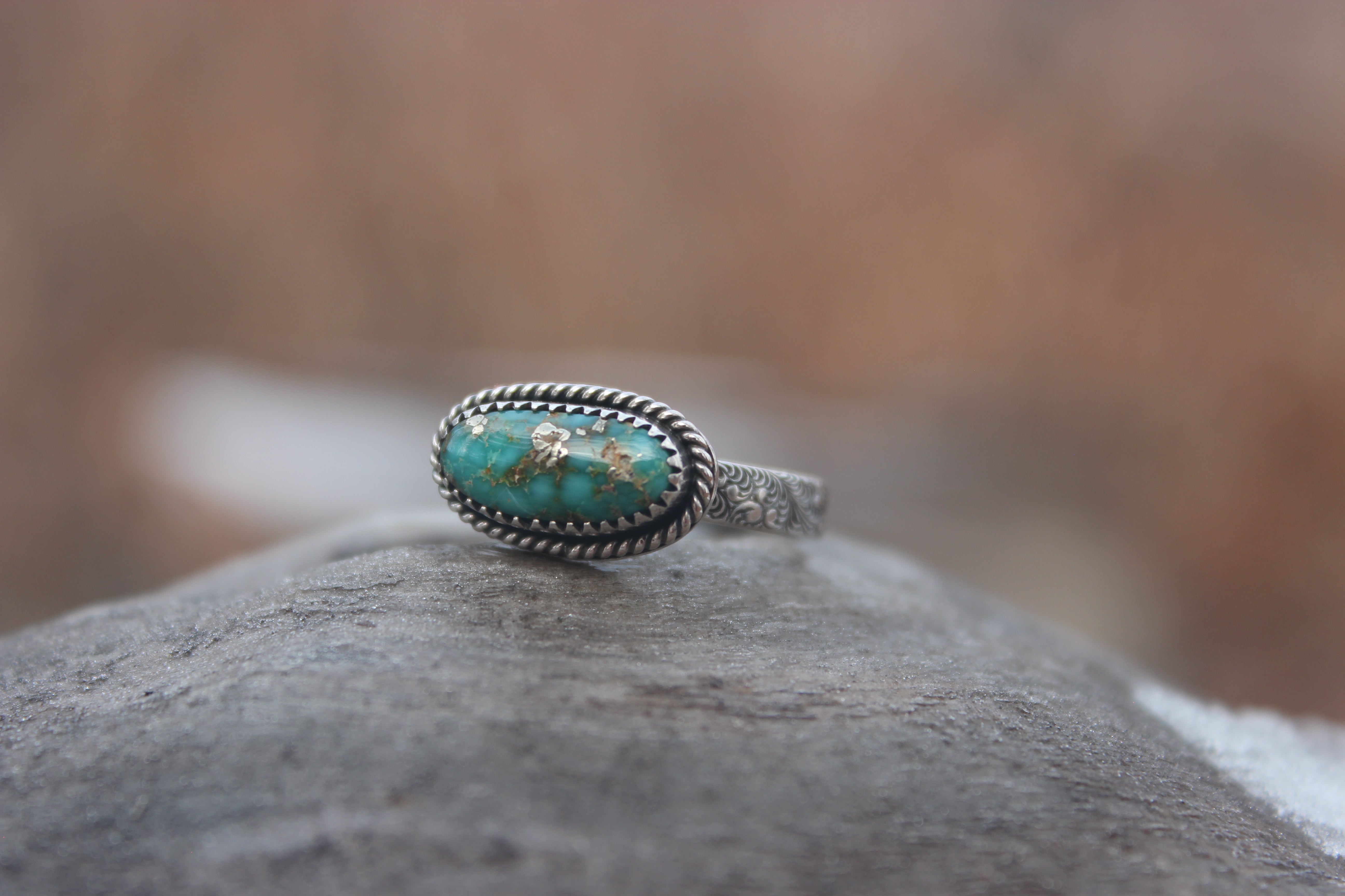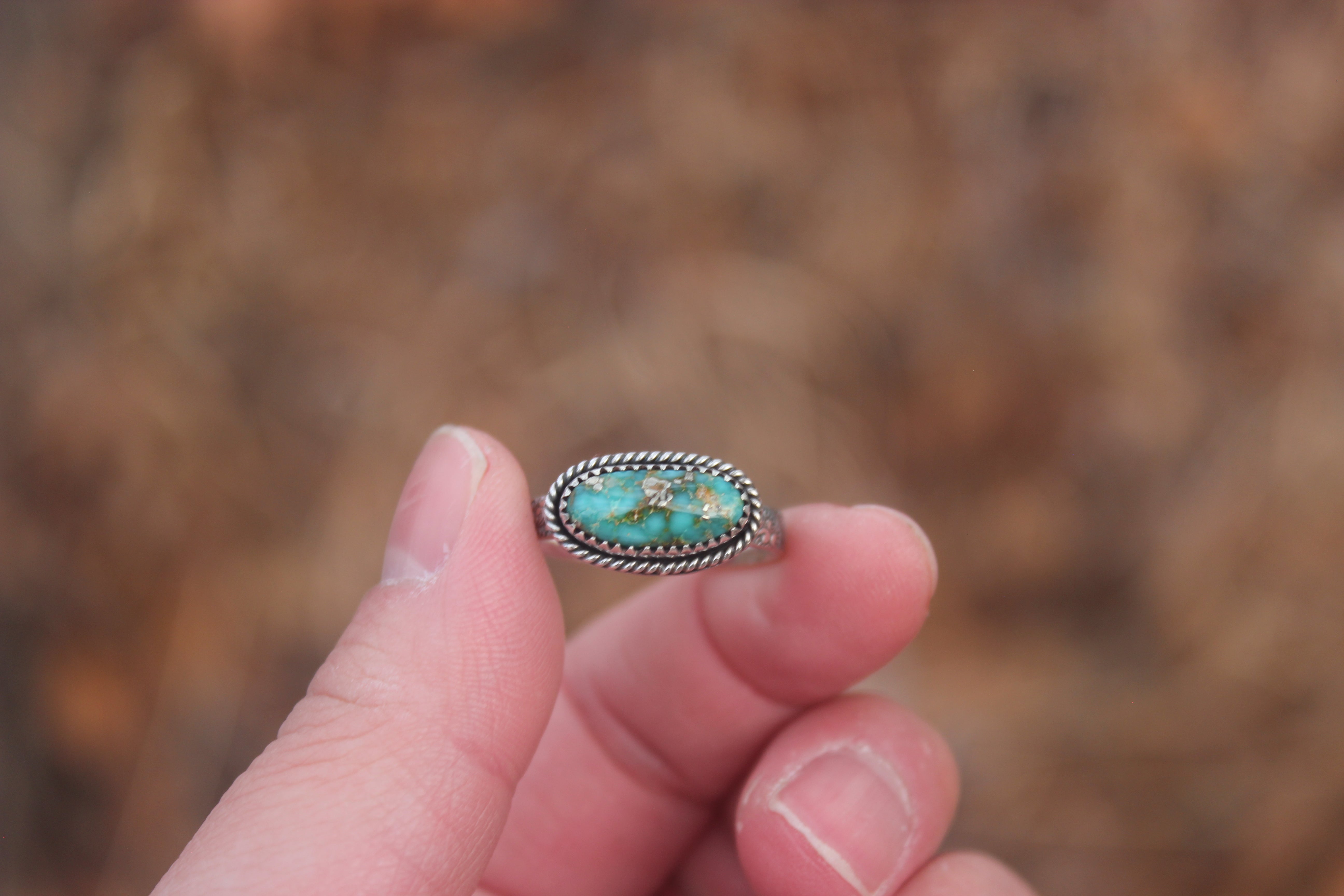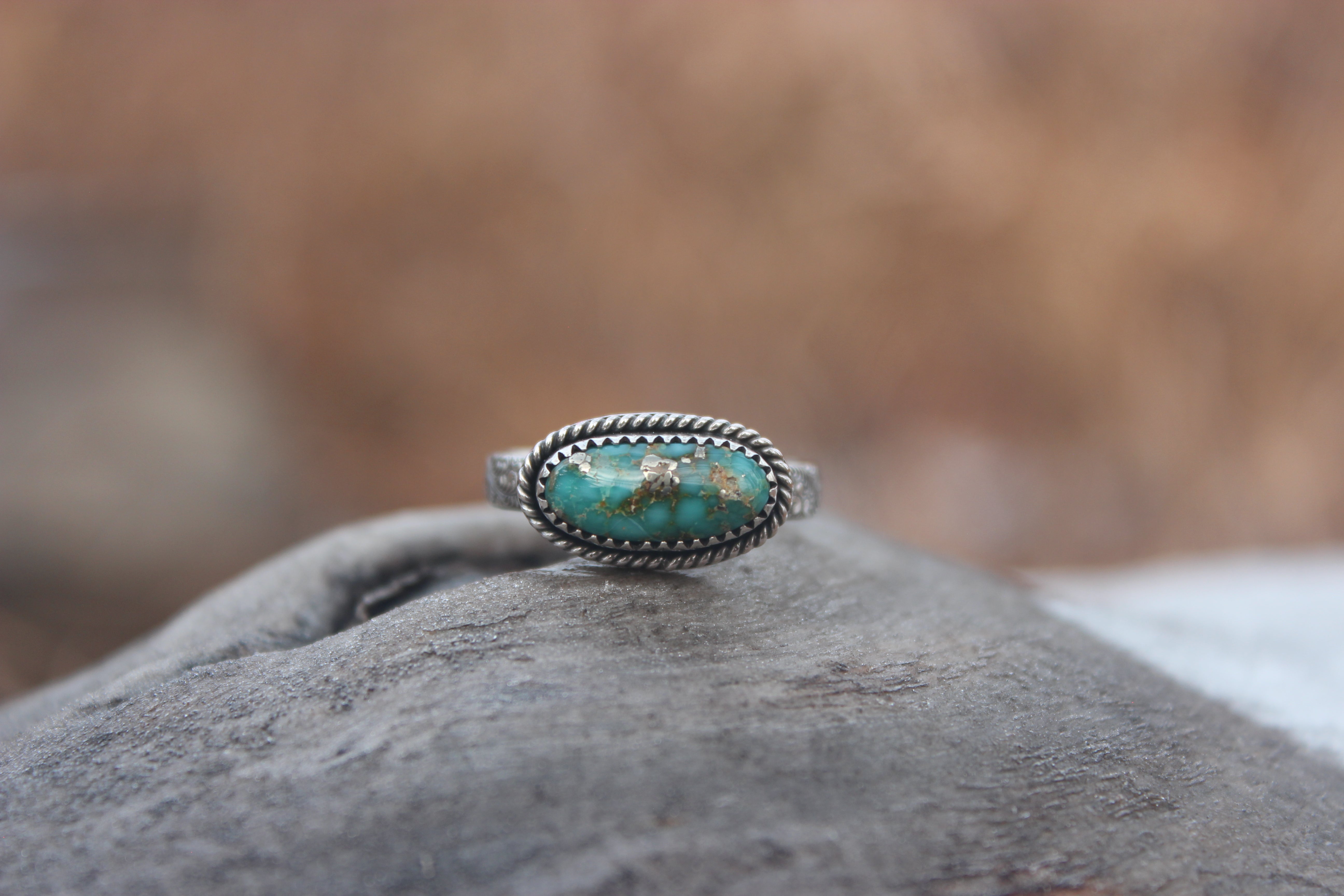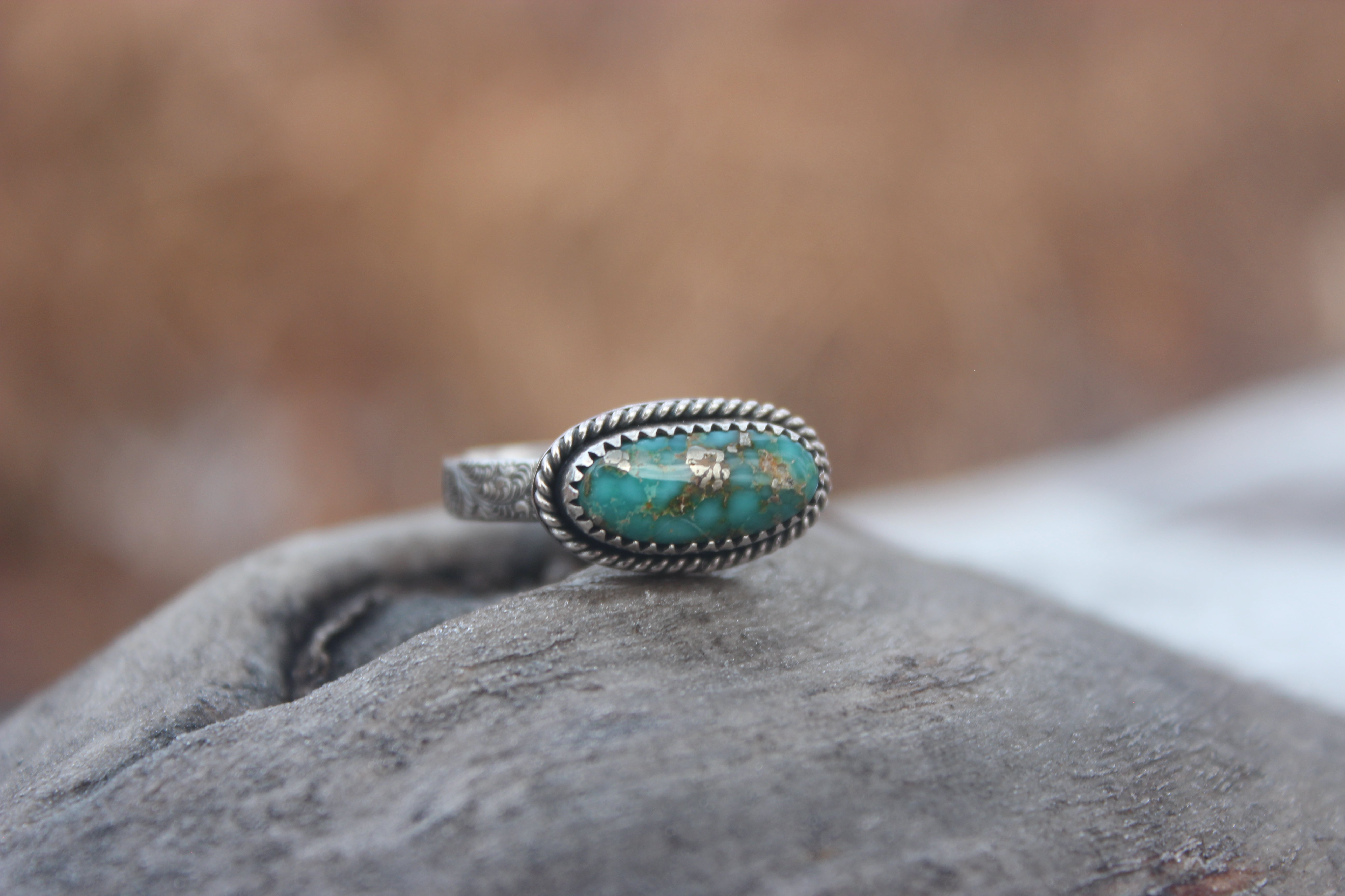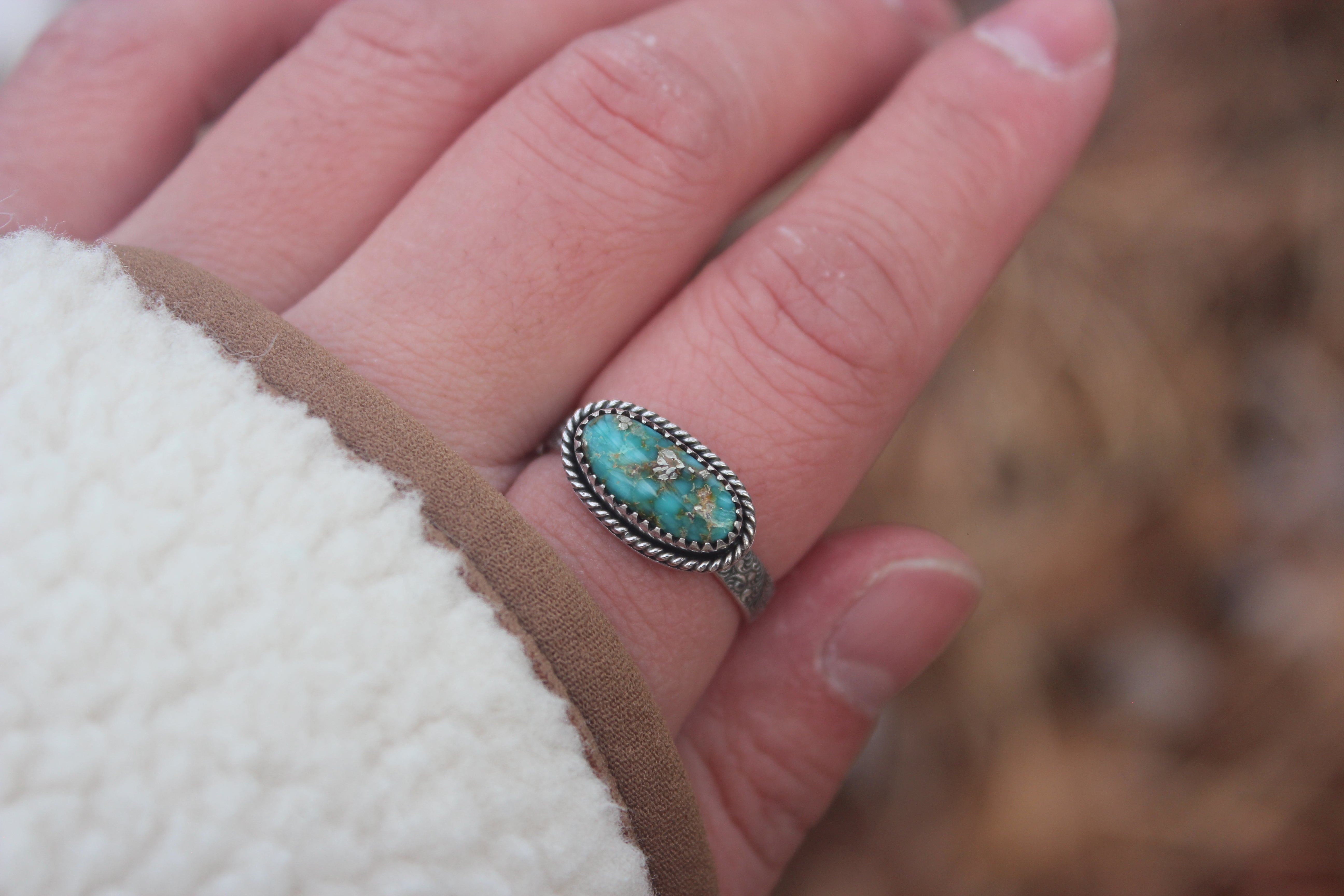 Gorgeous flecks of pyrite stand out against stunning pools of teal turquoise. Set atop an intricate, comfy band.