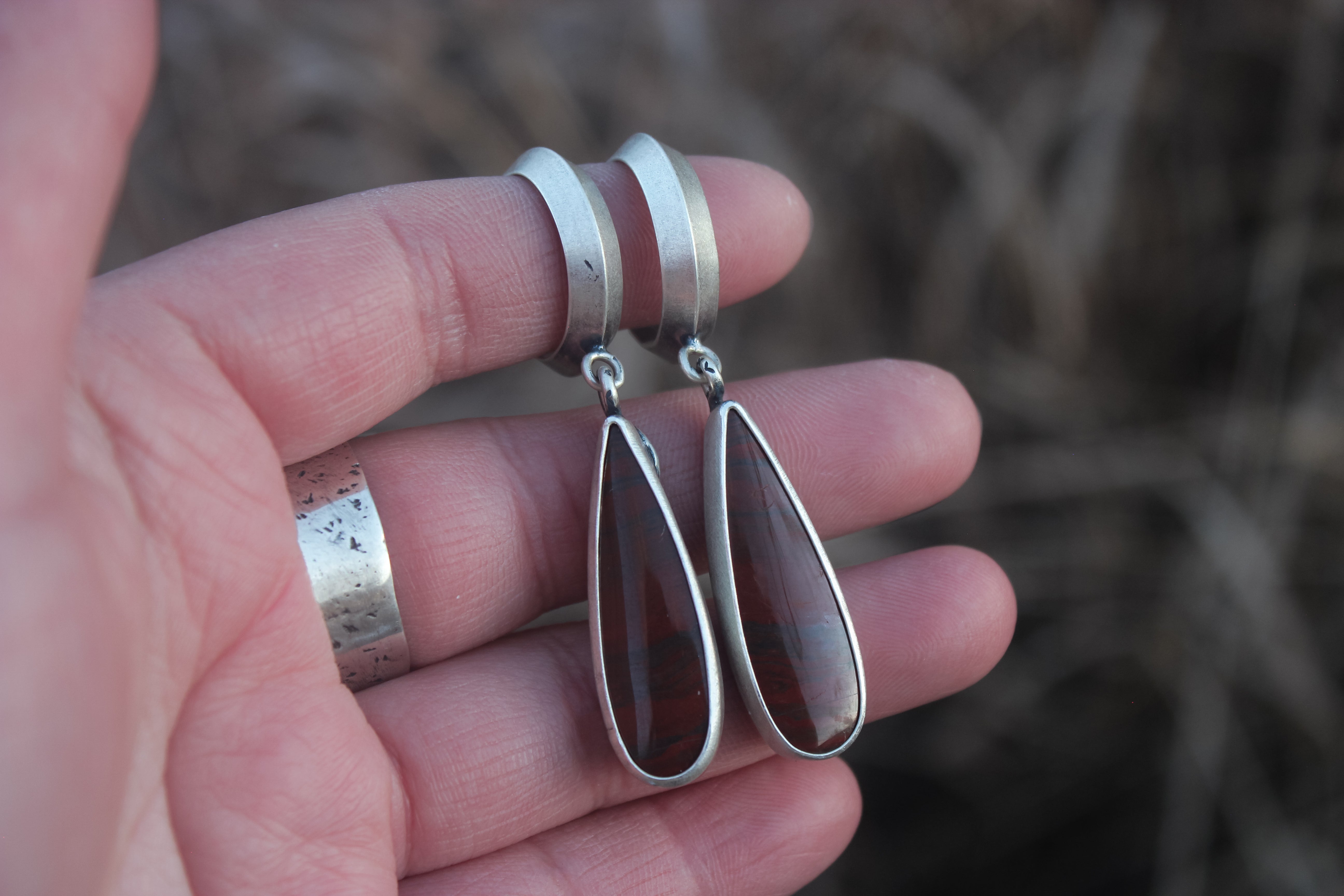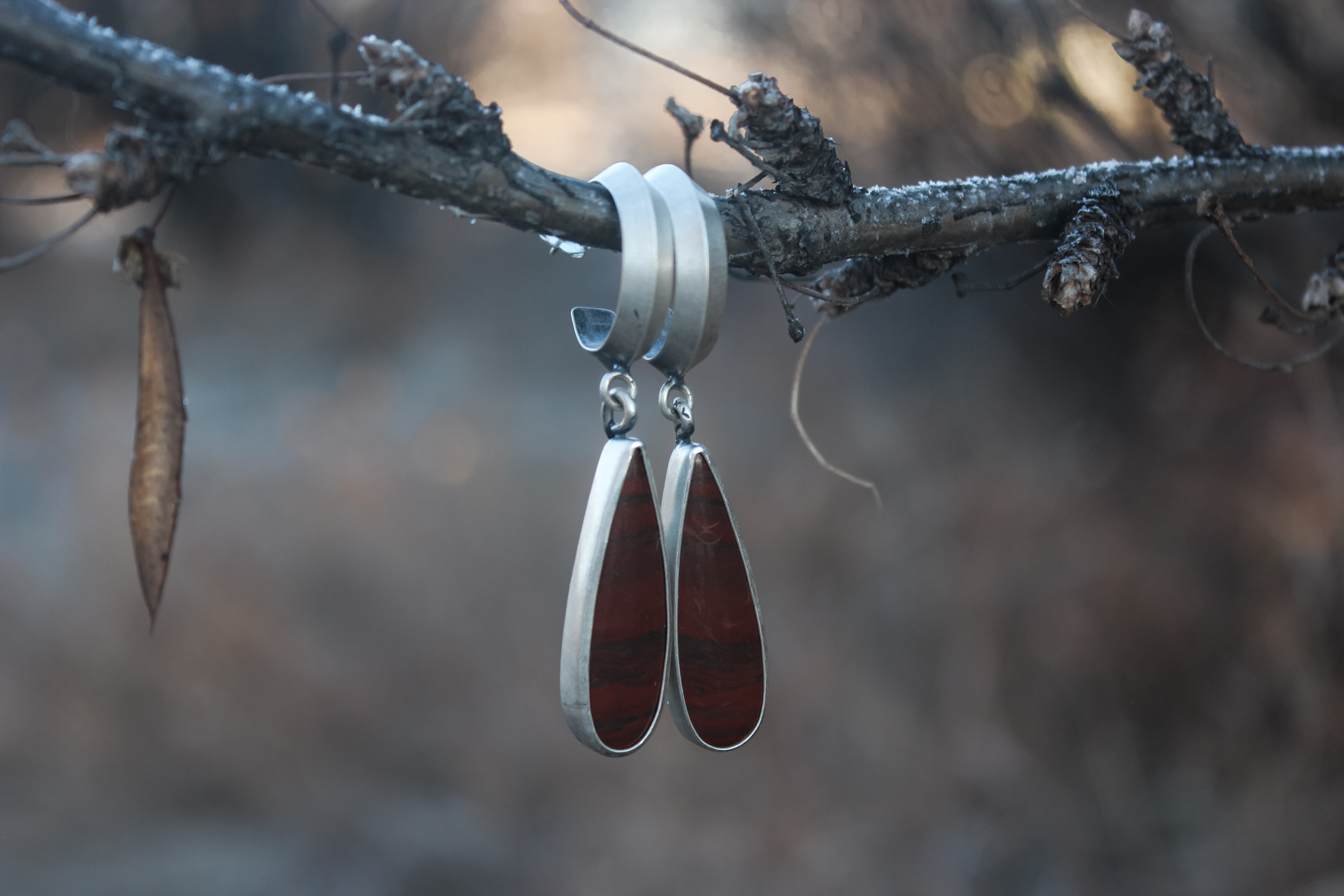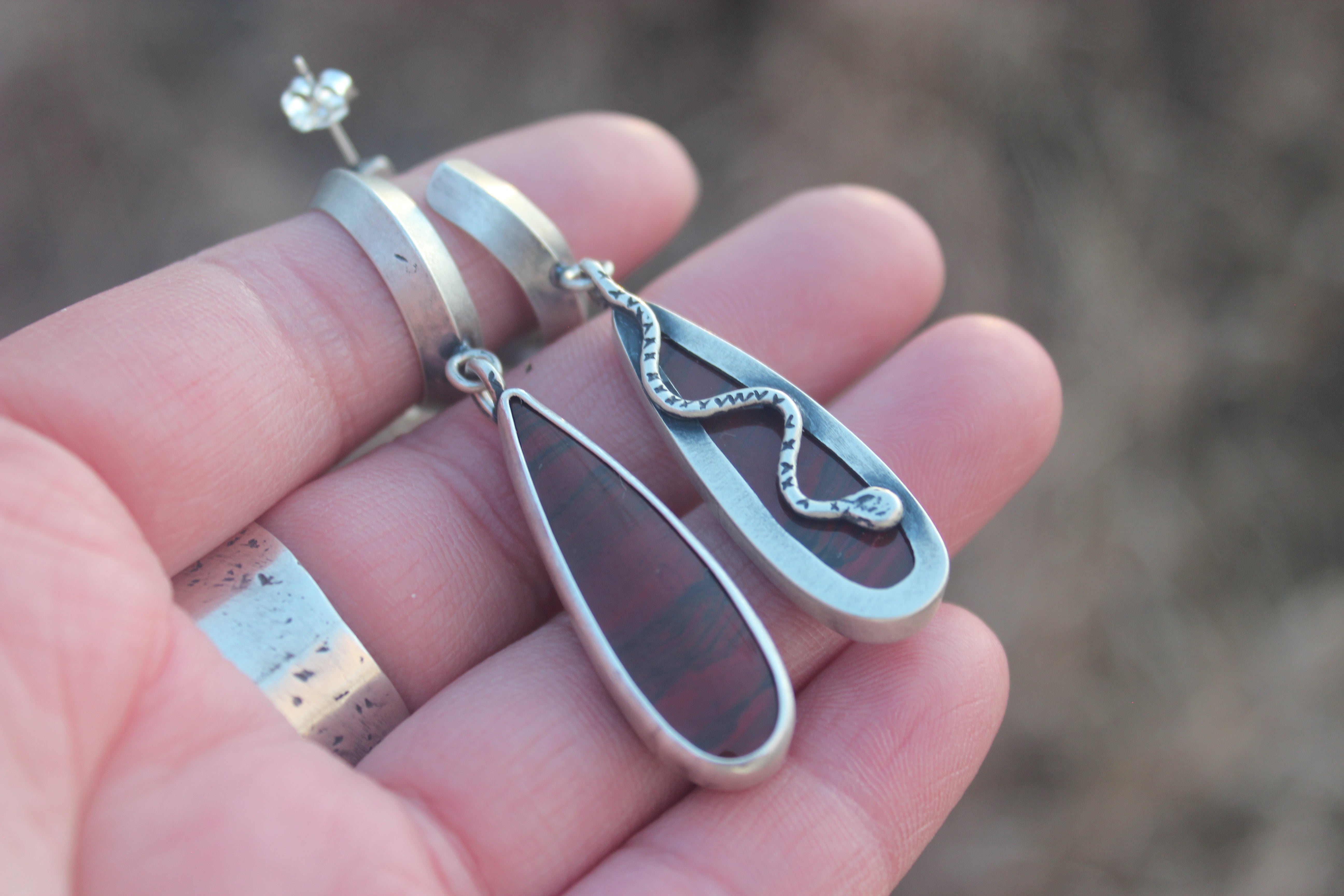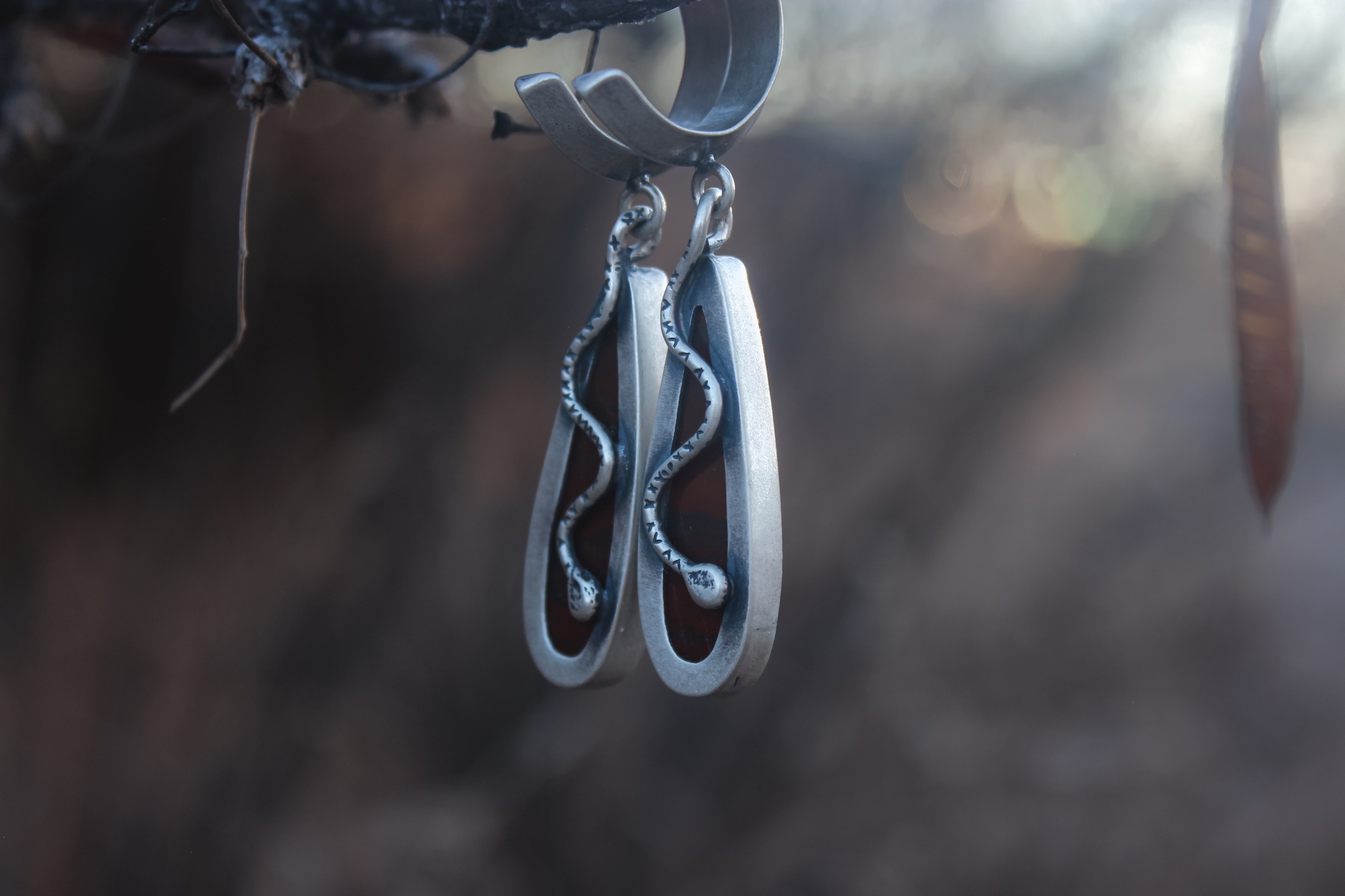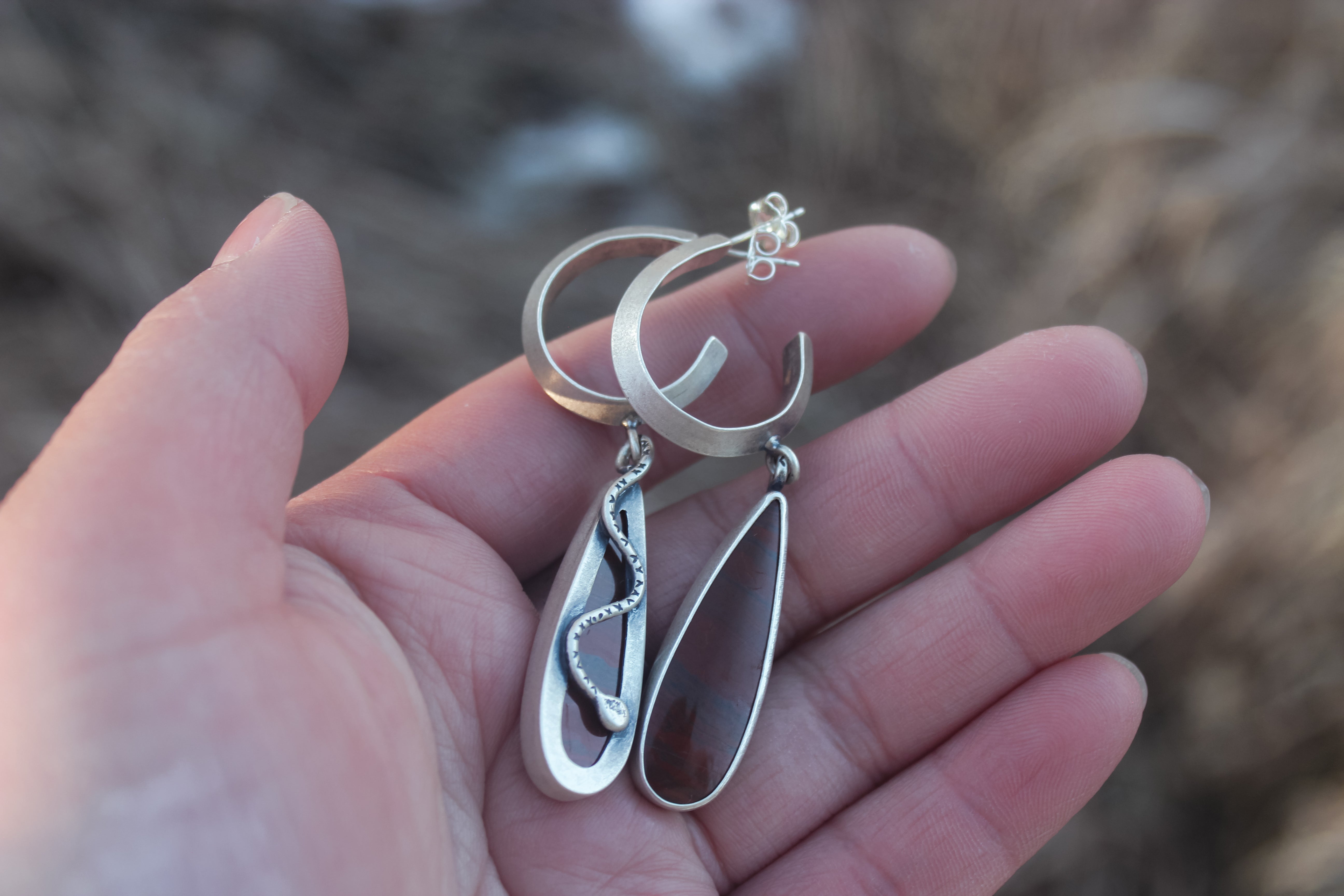 Blood red jasper stones dangle from sturdy triangle hoops, sneaky snakes trail down the backside, looping their tails around the hoop.