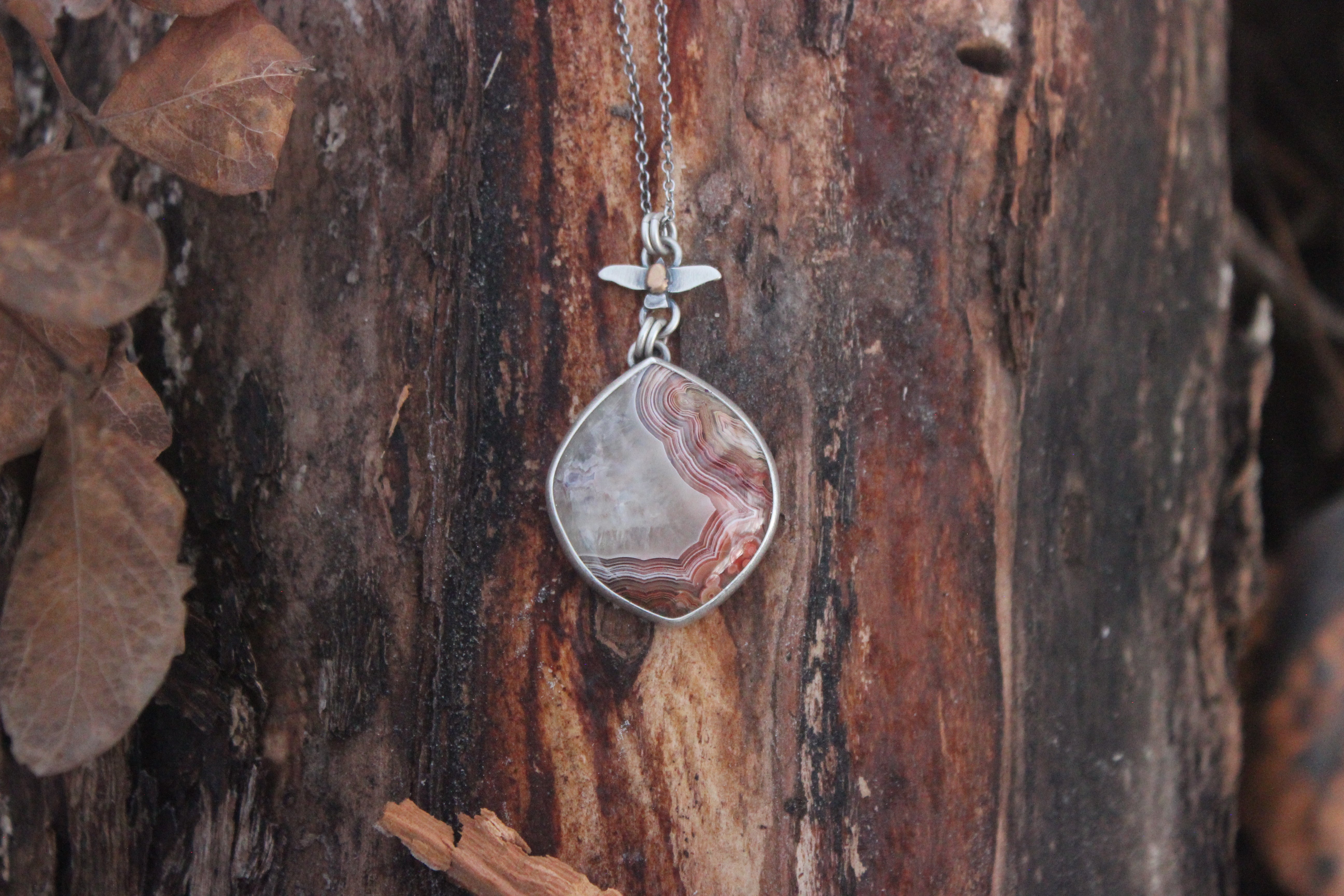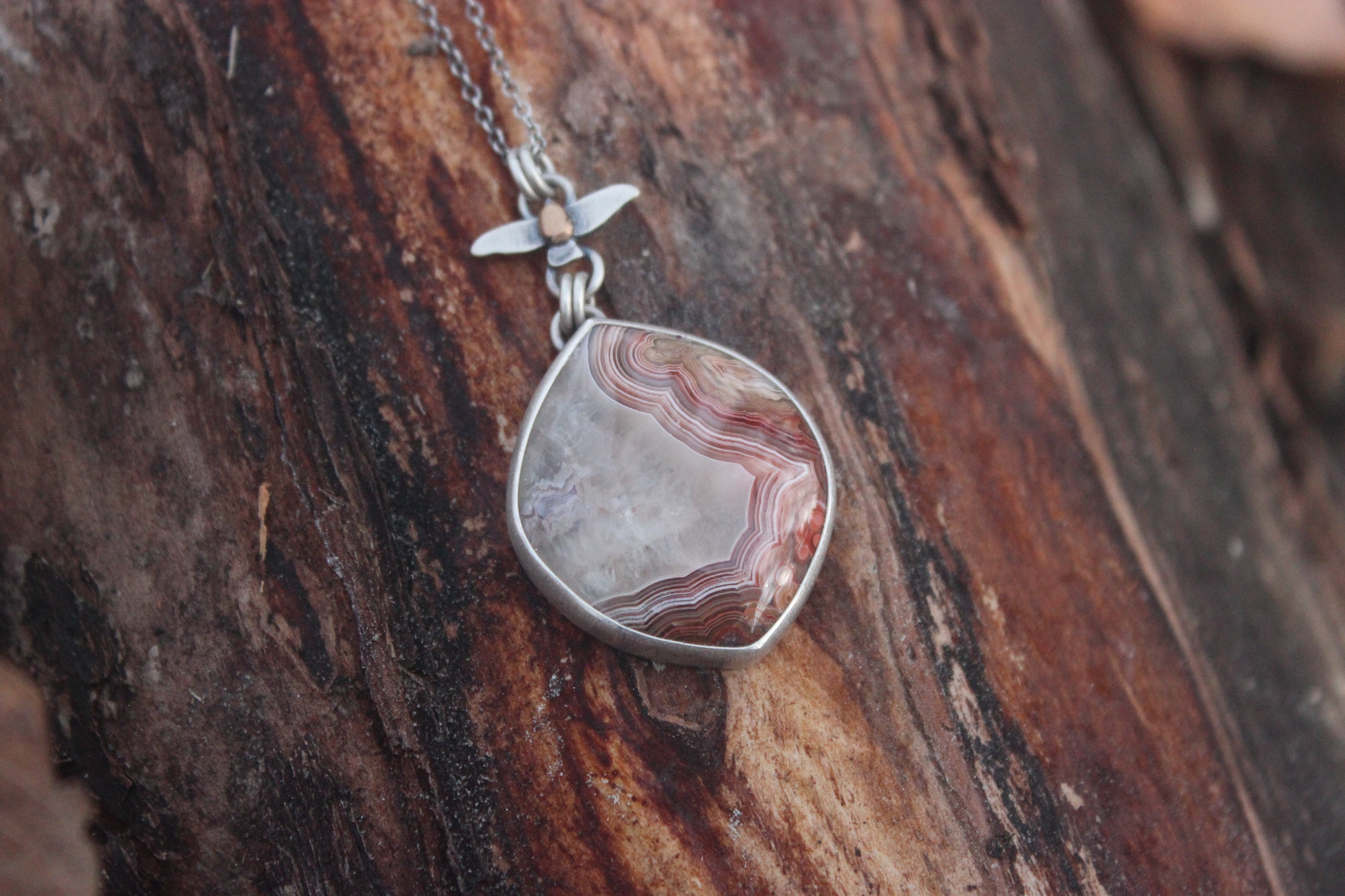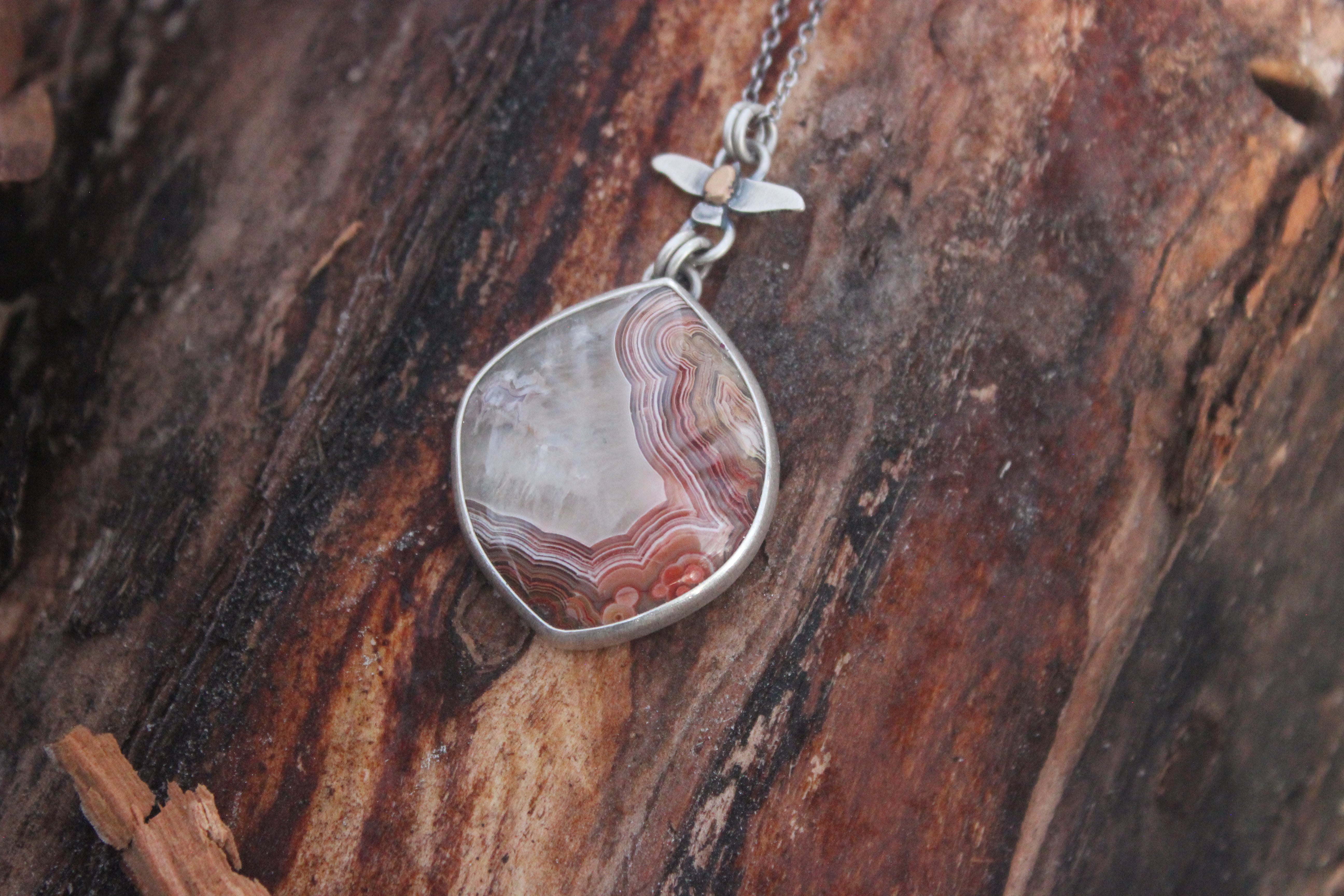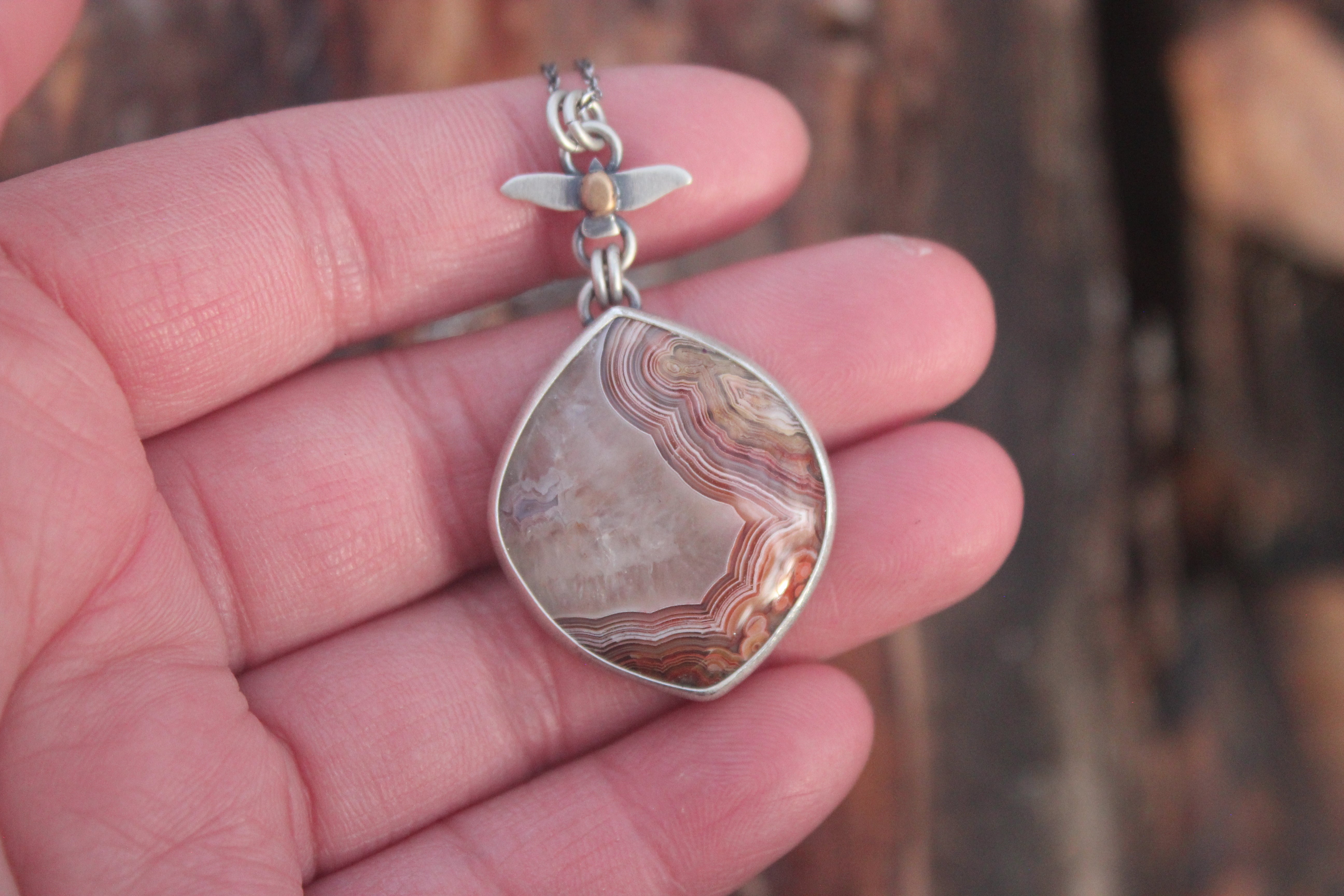 The bands in this stunning Laguna Lace agate are reminiscent of different layers of sediment climbing up a canyon wall. These strata make up the colors we see- rainbow ribbons running through river gorges.