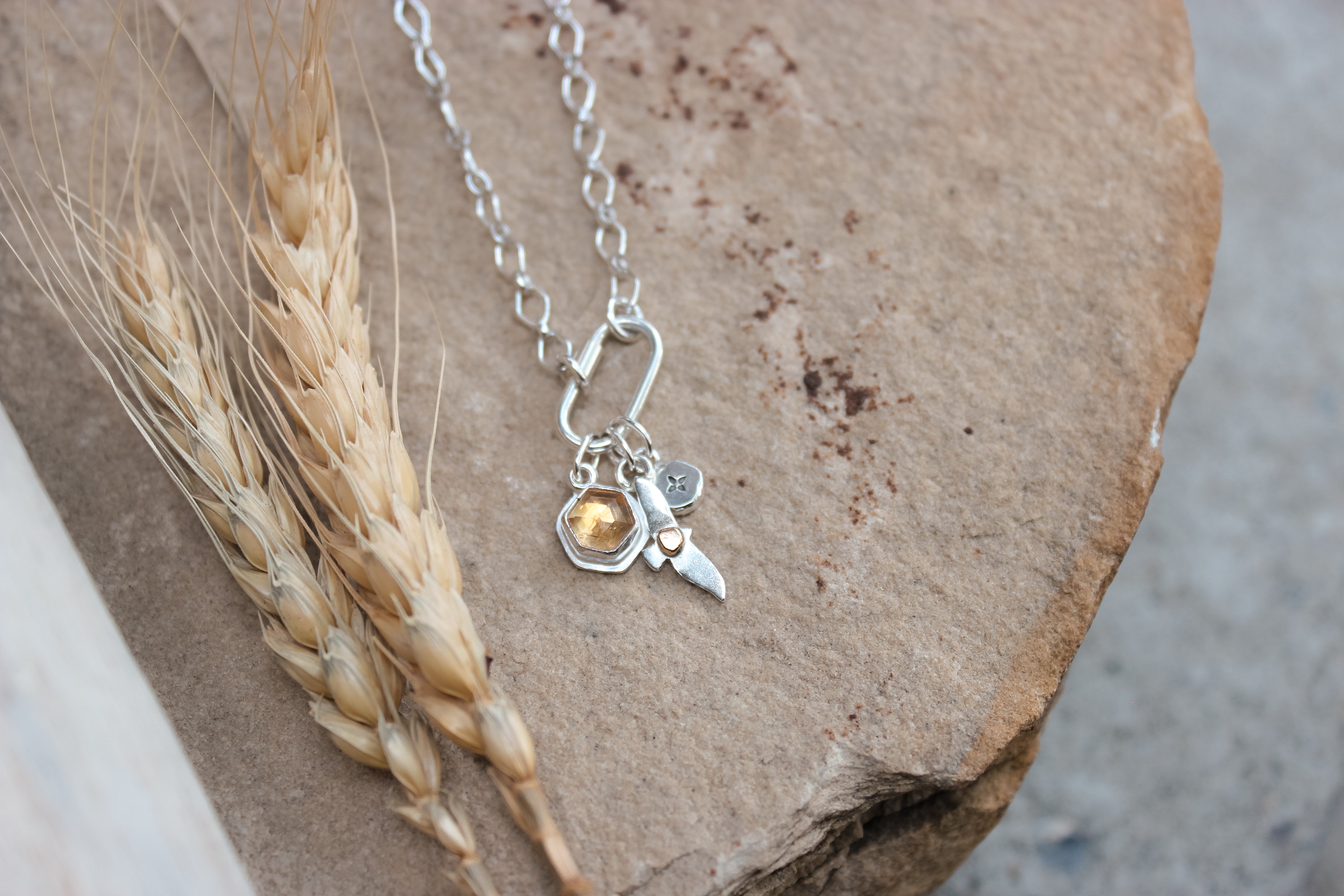 Who else loved the era of charm necklaces and bracelets?! This lovely, sophisticated version has a sturdy screw style carabiner that holds a set of 3 charms, bright and sunny with just a hint of sparkle. A bird with brass detail, a silver star pebble, and a sparkling citrine stone hang perfectly around your neck, dainty yet so adorable.